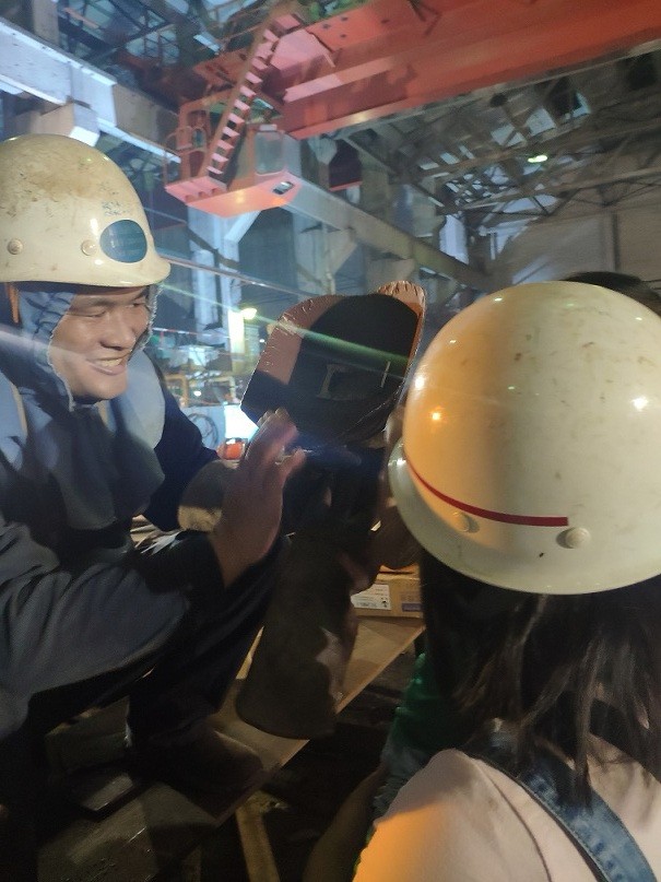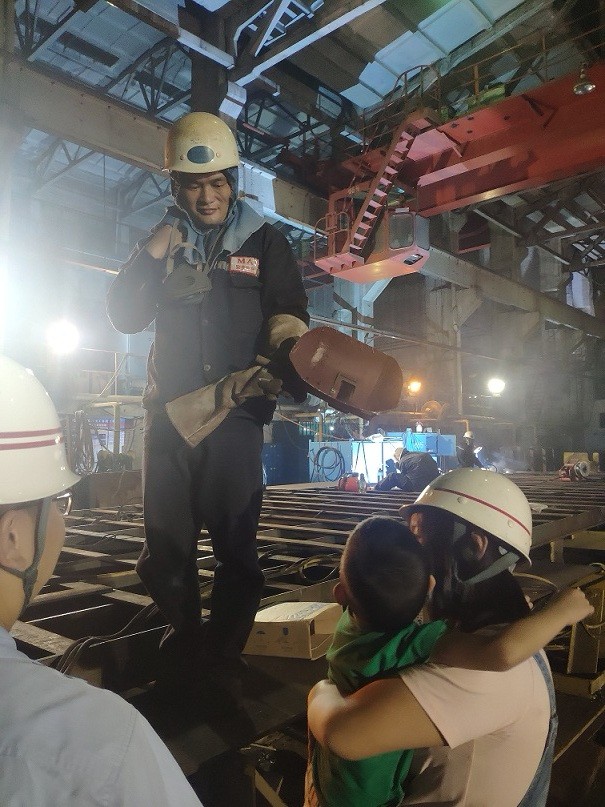 魯雄信是海洋工程部鉚焊工班的一名船舶電焊工,他的妻子每天既要工作,又要照顧年幼的孩子。在這次前往施工現(xiàn)場看望魯雄信之前,她對(duì)丈夫的工作不甚了解。路上,孩子時(shí)不時(shí)問媽媽:“爸爸在哪呀?”魯雄信的妻子一邊安撫孩子馬上就要見到爸爸了,一邊說,(項(xiàng)目緊張的時(shí)候)魯雄信時(shí)常加班,八九點(diǎn)才能到家,孩子很黏他爸爸。
