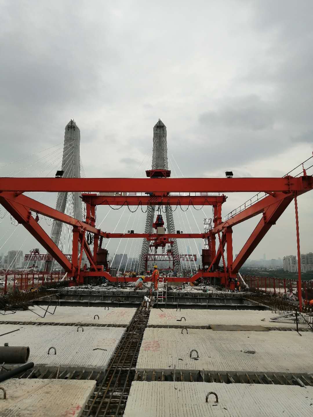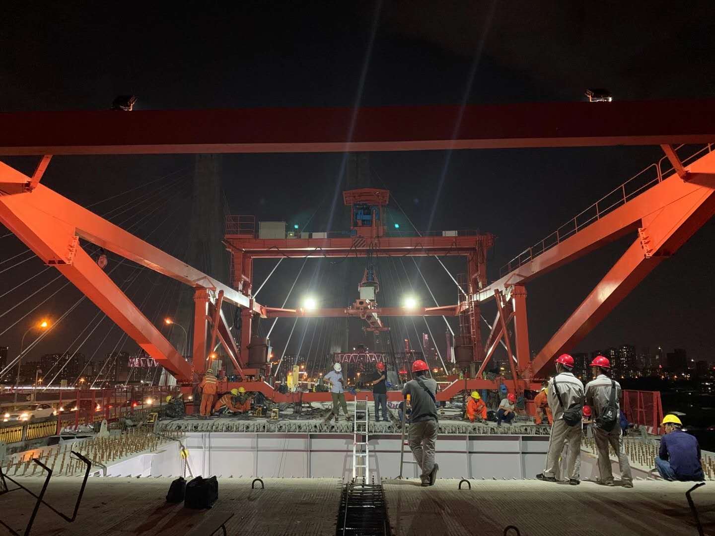 至6月份定位段安裝完成后,為了完成總體計劃目標(biāo),業(yè)主方提出按照每個節(jié)段施工6天的標(biāo)準(zhǔn)周期編制計劃,主橋按照8臺橋面吊機、4臺履帶吊共12個作業(yè)點同步作業(yè),這對于項目組來說是巨大的挑戰(zhàn)。再加上施工現(xiàn)場無堆場,只能當(dāng)天到貨安排卸車吊裝,這無疑又增加了難度。為了按照周期完成節(jié)點任務(wù),項目組與施工班組進一步分解生產(chǎn)計劃,落實各作業(yè)點施工人員,跟進現(xiàn)場工作調(diào)配,運輸、卸車吊裝、裝配、焊接、焊縫無損檢測、補涂都按照小時計劃編制,確保了各個吊裝工位的吊裝分段節(jié)點按期完成,為下一道混凝土澆筑、斜拉索安裝工序爭取施工時間。