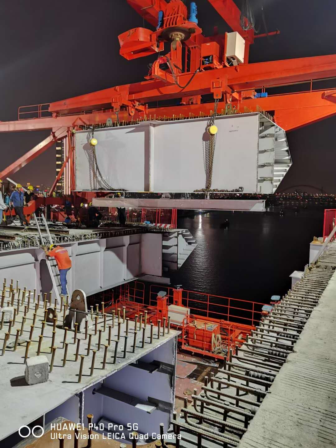 該項目在春節(jié)后受疫情影響,橋梁主塔基建施工單位進度滯后,原計劃的現(xiàn)場吊裝節(jié)點延后2個月,導(dǎo)致現(xiàn)場吊裝周期壓縮。為了保障年底通車目標(biāo),項目組調(diào)整吊裝技術(shù)方案,將原來的橋塔定位段小節(jié)段吊裝調(diào)整為總段吊裝,把鋼箱梁、風(fēng)嘴、中橫梁、小縱梁結(jié)構(gòu)在廠內(nèi)總拼后再運往現(xiàn)場安裝。通過對制作場地、技術(shù)方案、吊機設(shè)備提前策劃,施工班組克服外場施工難度大、雨水天氣較多等不良因素影響,加班加點完成任務(wù),并順利通過驗收及時發(fā)貨,確保5月1日順利吊裝。