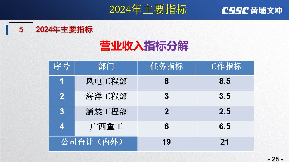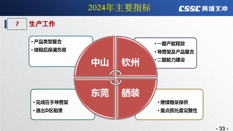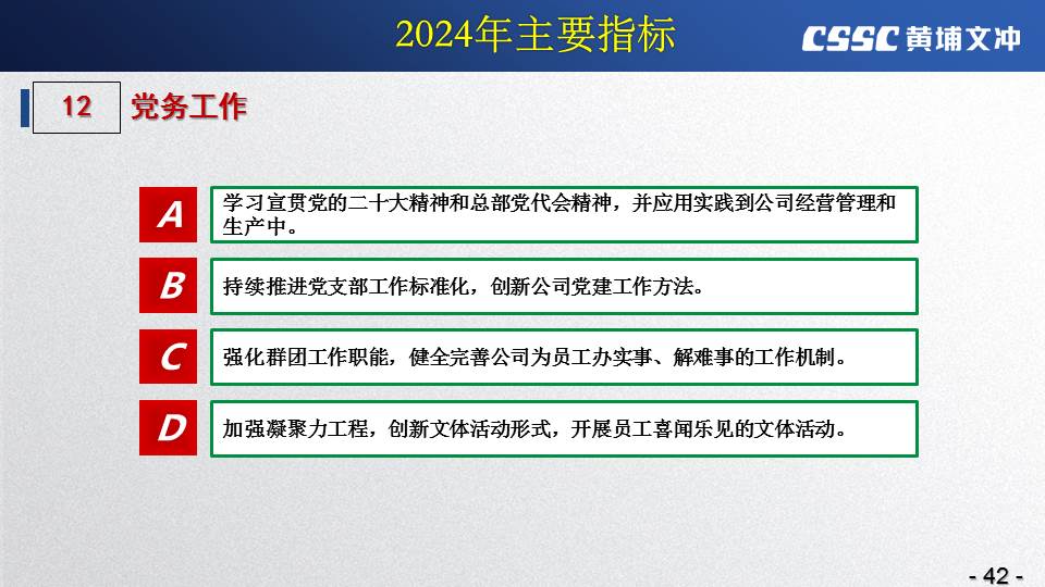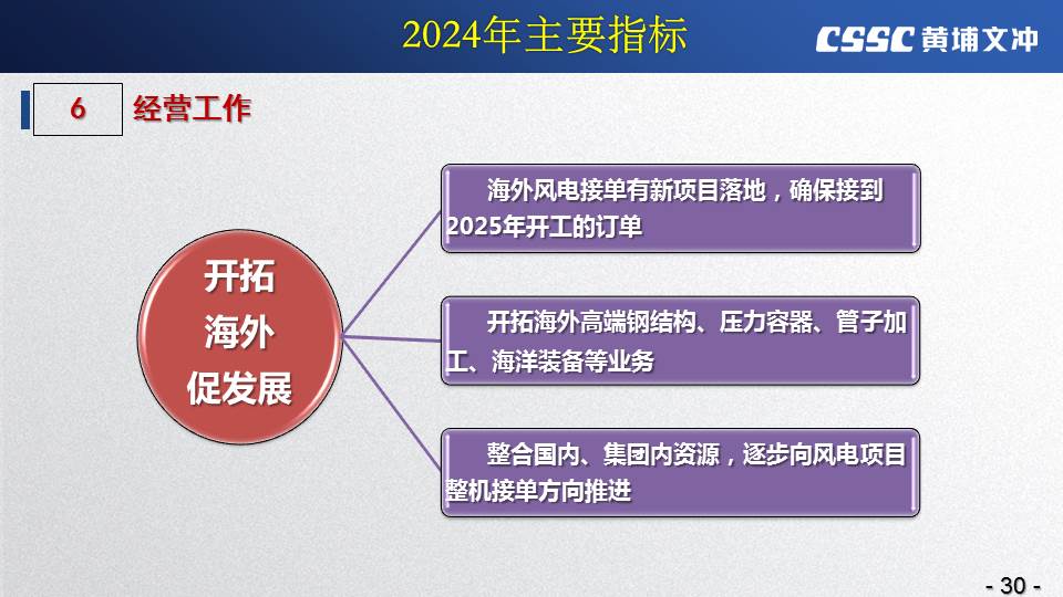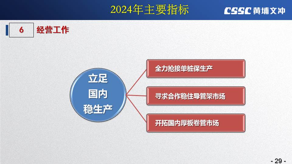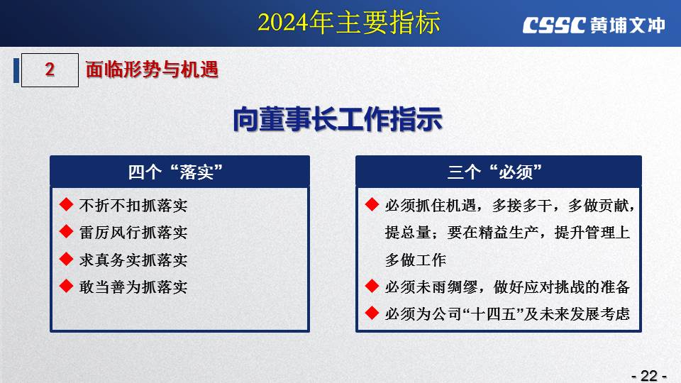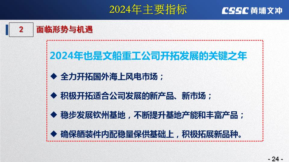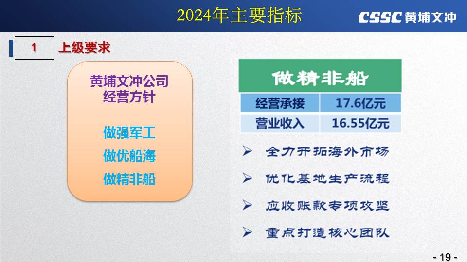 黃埔文沖公司羅兵總經(jīng)理指出,公司在過去的一年所取得的成績不容易,指標基本完成,海外訂單有實質(zhì)性突破,國內(nèi)訂單承接情況不錯,管理團隊精氣神不錯。面對當前的形勢機遇,羅總指出公司的未來發(fā)展大有希望!羅總要求全體干部員工要繼續(xù)保持高昂的斗志和滿滿的信心,繼續(xù)奮斗,并就公司2024年工作作了以下重要指示: