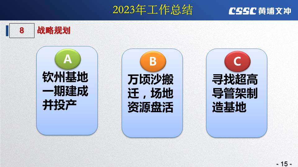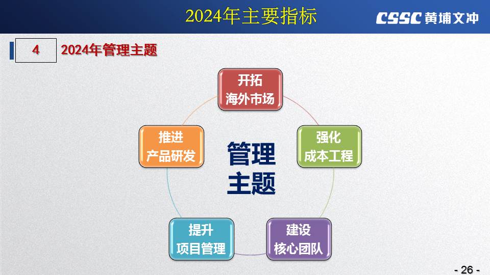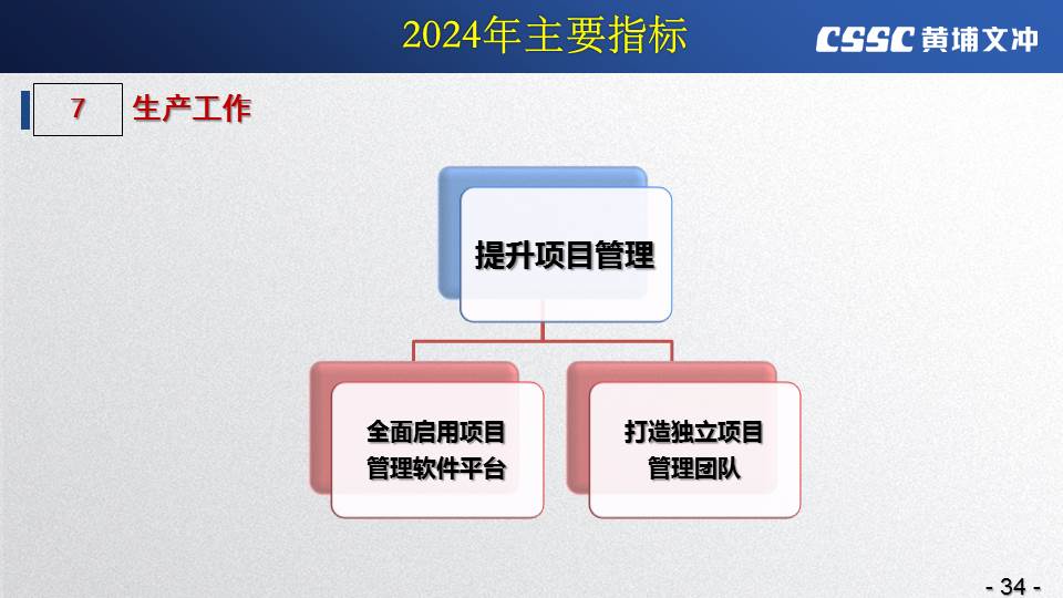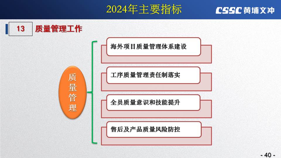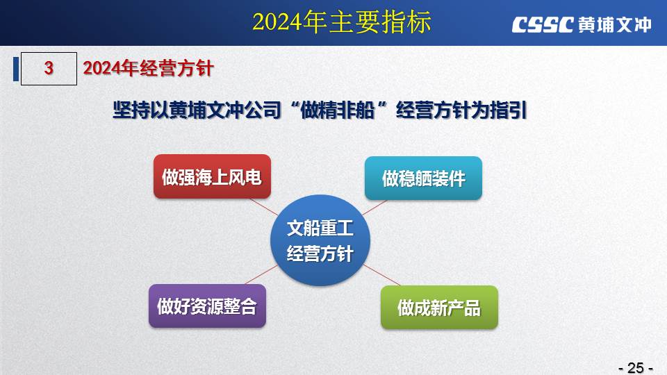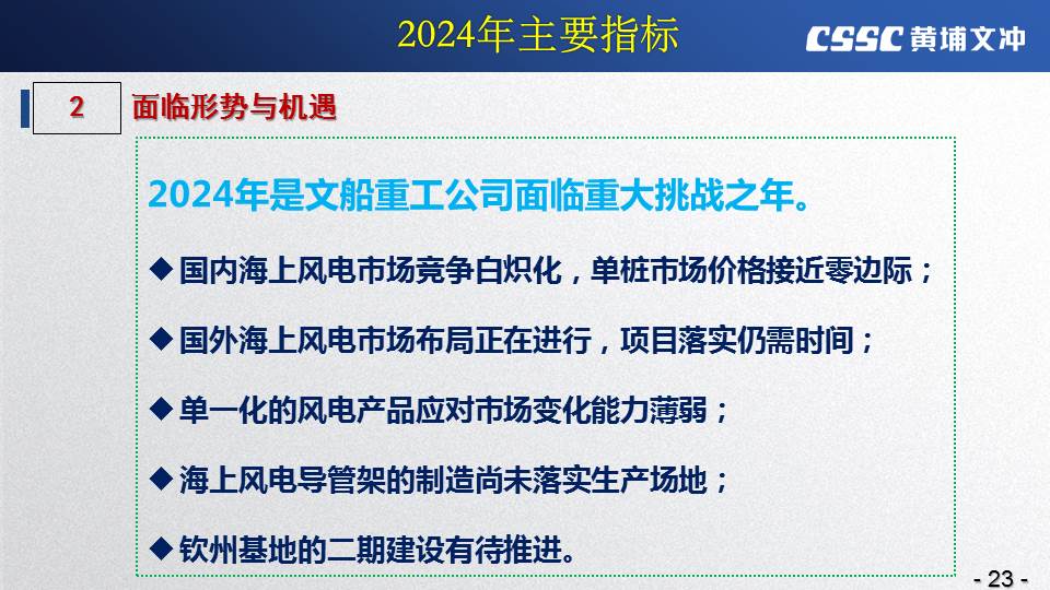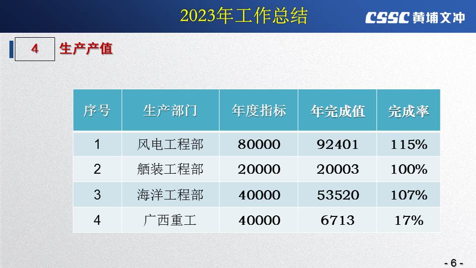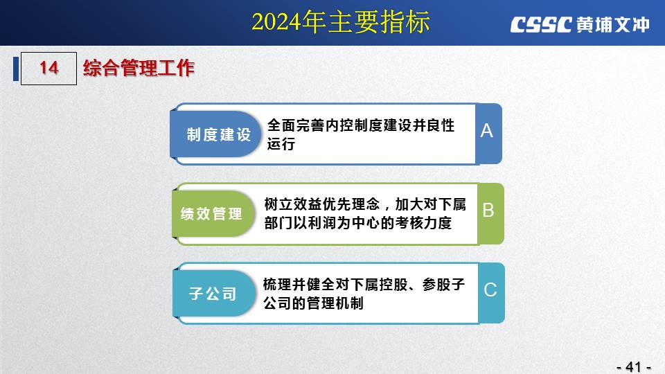黃埔文沖公司羅兵總經(jīng)理指出,公司在過去的一年所取得的成績不容易,指標基本完成,海外訂單有實質(zhì)性突破,國內(nèi)訂單承接情況不錯,管理團隊精氣神不錯。面對當前的形勢機遇,羅總指出公司的未來發(fā)展大有希望!羅總要求全體干部員工要繼續(xù)保持高昂的斗志和滿滿的信心,繼續(xù)奮斗,并就公司2024年工作作了以下重要指示: