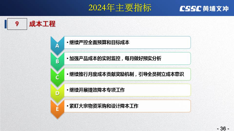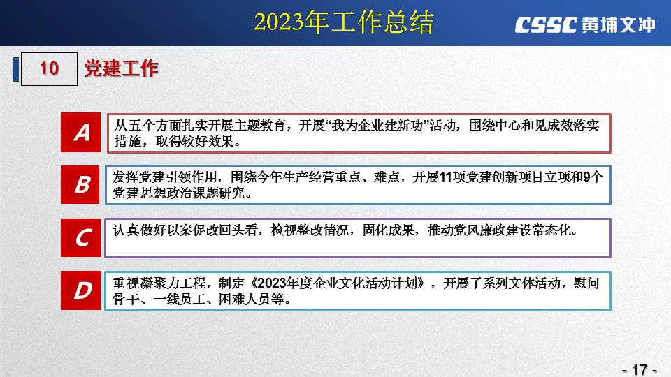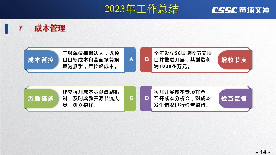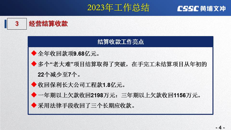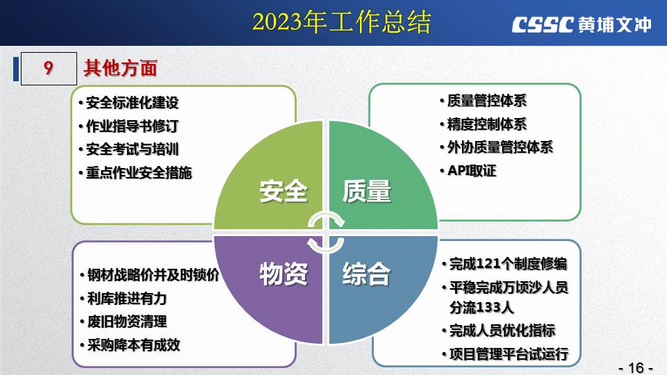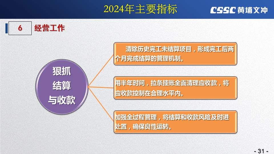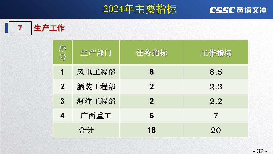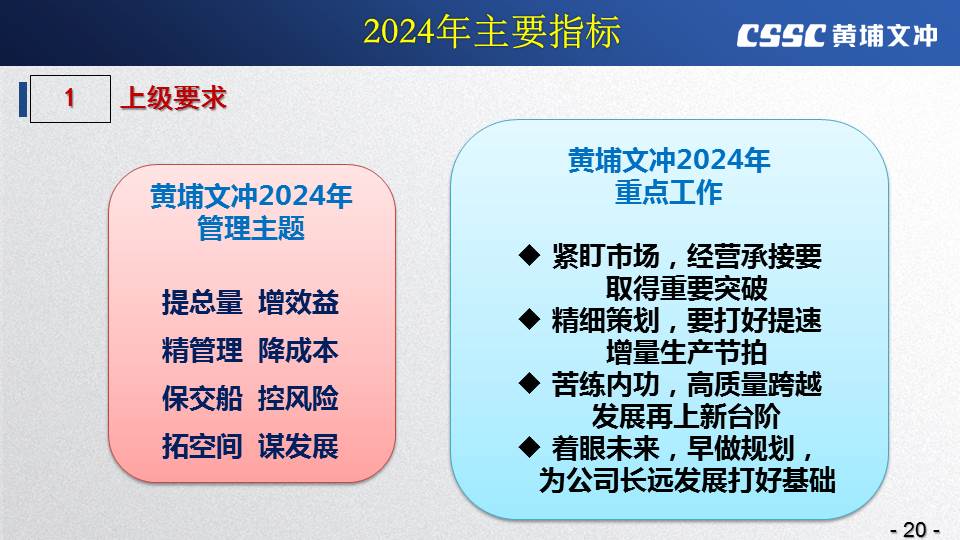 黃埔文沖公司羅兵總經(jīng)理指出,公司在過去的一年所取得的成績不容易,指標基本完成,海外訂單有實質(zhì)性突破,國內(nèi)訂單承接情況不錯,管理團隊精氣神不錯。面對當前的形勢機遇,羅總指出公司的未來發(fā)展大有希望!羅總要求全體干部員工要繼續(xù)保持高昂的斗志和滿滿的信心,繼續(xù)奮斗,并就公司2024年工作作了以下重要指示: