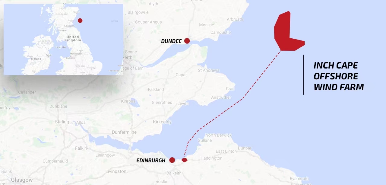 Inch Cape海上風(fēng)電場位于英國北海,距Angus海岸約15公里,總投資額超過200億元,總?cè)萘繛?.1GW,單機(jī)適配國外某風(fēng)機(jī)廠容量為15MW風(fēng)機(jī),共建設(shè)72套風(fēng)電機(jī)組,預(yù)計2026年完成并網(wǎng),將為160多萬家庭輸送電力。